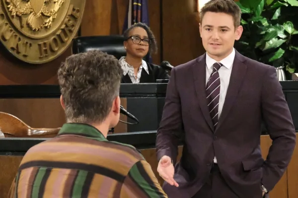 Leo (Greg Rikaart) speaks with the bailiff.