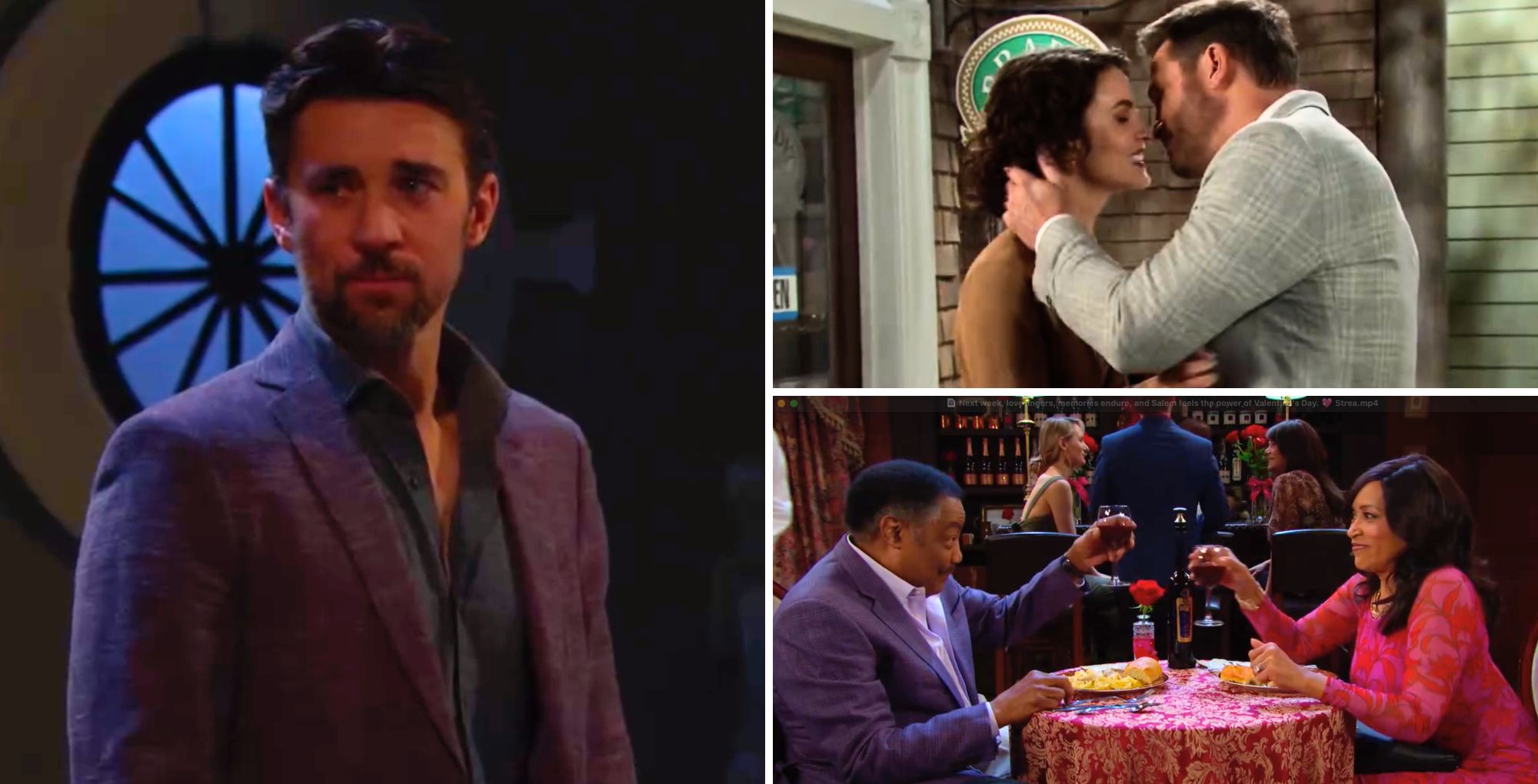 Some of Salem’s favorite couples celebrate Valentine’s Day. Paulina (Jackée Harry) and Abe (James Reynolds) make a toast in honor of the occasion, while Steve (Stephen Nichols) and Kayla (Mary Beth Evans) share a sweet kiss across the table at the Bistro.