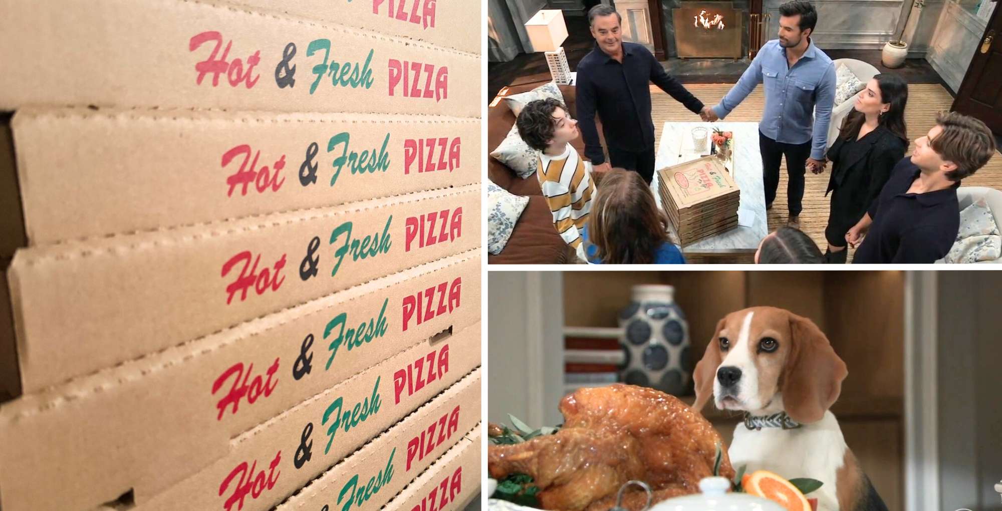 Once they accepted their fate, they decided to donate Chase’s meal to GH while Ned and Gio got a surprise at the door. When everyone returned, they were greeted with a stack of pizza boxes, courtesy of Tracy (Jane Elliot). First they sang, then they ate, in true Quartermaine Thanksgiving tradition.